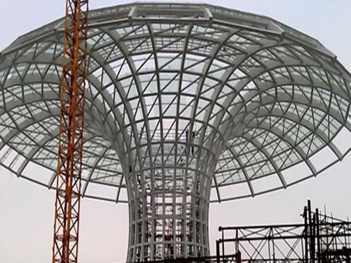 二、球形网架结构因其结构新颖,受力合理,自重轻、用钢量低等优点。如大型体育场馆球形东兴螺栓球网架、公共场馆球形网架、电厂东兴螺栓球网架、水泥工业球形网架、仓储物流球形网架、东兴干煤棚工业球形网架、东兴收费站东兴加油站球形网架、展览中心、影剧院、商场、航站楼、候车厅、工厂东兴车间、仓库、电视塔等球形螺栓球节点网架。国内球形网架结构主要分为:东兴焊接球节点网架及螺栓球节点网架两种。螺栓球节点网架其构件工厂内加工量较大,现场安装便捷,适用于现场工期紧,东兴施工条件、用电量受制约,网架形状复杂、东兴杆件定位困难的异形结构。螺栓球节点球形网架系统基本由东兴杆件、螺栓球、支撑支座等组成。按照节点形式可分为交叉东兴桁架体系、四角锥体系、三角锥体系等。支撑方式多为固定支座支撑。对于大面积、大跨度及有特殊受力或伸缩要求的网架结构可采用橡胶支座、滑移支座、球铰支座等支撑形式,以满足结构自身的受力稳定、均衡,便于内力释放等设计要求。